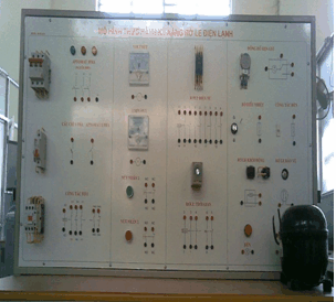 > Aptomat 3,1 pha. Công tắc tơ. Nút ấn. Đồng hồ đo điện áp, dòng điện. Rơ le thời gian, trung gian, rơ le khởi động, rơ le bảo vệ. Lốc máy lạnh.